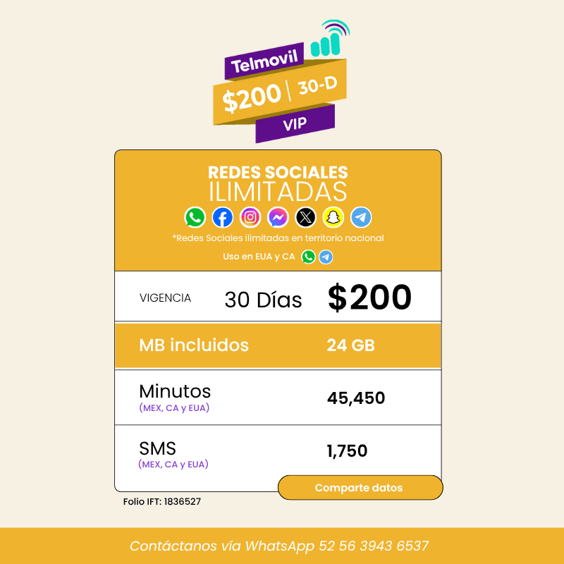 Recibirás 30 días de servicio que podrás utilizar en llamadas, mensajes y redes sociales ilimitadas (en Territorio Nacional). Además de 24 GB para navegación.